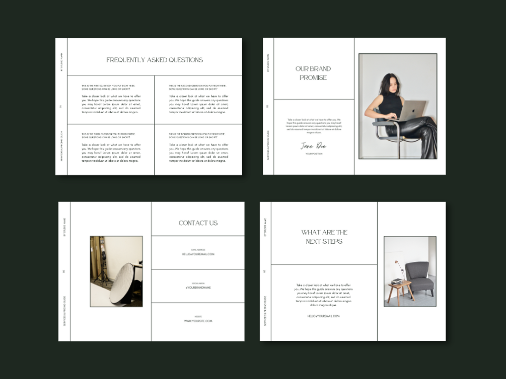 An effective services & pricing guide helps you cultivate a strong brand and positions you as an expert in the minds of your customers. In addition, it's beautiful and on-brand. Add value to your business with this in-depth Services & Pricing Guide template. This is a great tool to complement your precious business and show off your amazing talents, skills, services, and products to your clients in a professional and beautiful layout.