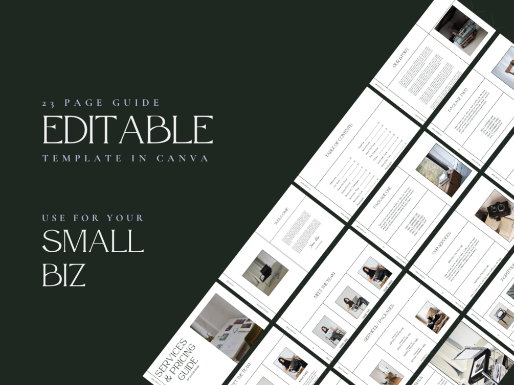 A PDF file containing the Canva template link • 23 Pages containing: • Welcome • Our Story • Meet The Team • Expectations • Services / Packages • Our Services • Packages •Timeline •Testimonials • Portfolio •The Process • FAQ’s • Our Brand Promise • Contact • Next Steps •Thank You